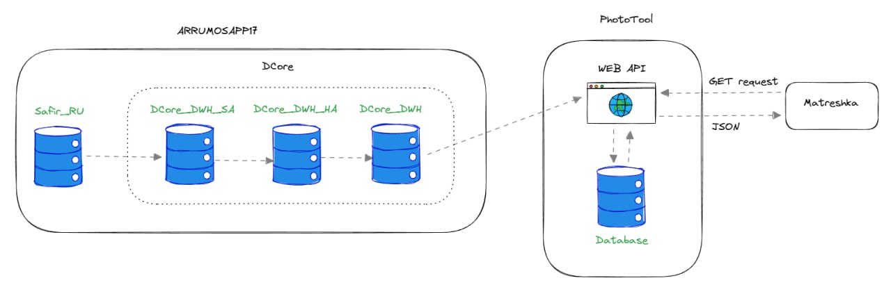 Экспорт данных выполняется в автоматическом режиме ежедневно в 17:00 по московскому времени (GMT+3) с помощью задачи (Job) в SQL Server Agent: DWH_Export_MD_to_PhotoTool в шаге Export Matreshka Data